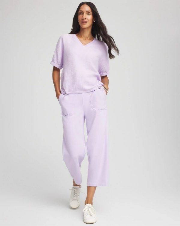 Crafted from lightweight and luxurious French terry knit featuring gauze inset side seams, these bottoms have a comfortable wide-leg fit. Ribbed-trim front pockets offer beautiful coverage. Featuring a ribbed-knit back waistband for ease of wear. Pair with matching Zenergy® tops showcasing the season’s gauze accents.