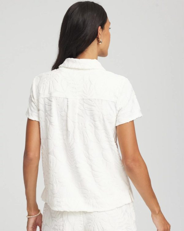 Showcasing a textured tropical motif, this neutral Zenergy® Terry Cloth Top matches perfectly with its Terry Cloth Shorts. Featuring a collared split neckline, and placket pocket. Cut from absorbent terry cloth —perfect for staying cozy, cool, and dry.