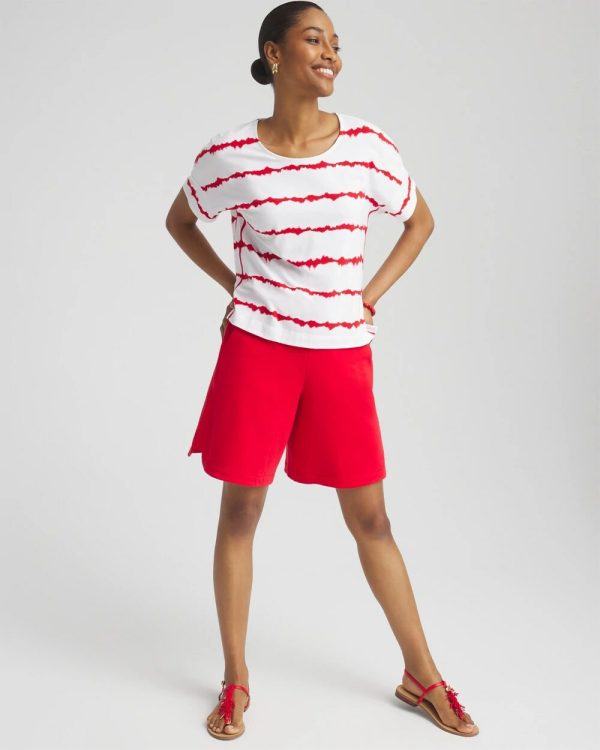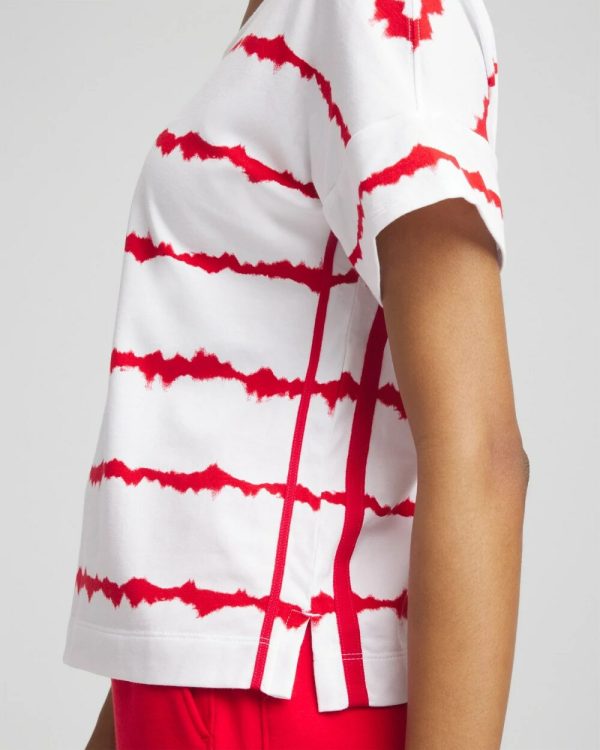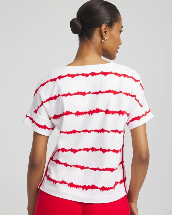 Lightweight knit fabric rated UPF 50+ to block both UVA and UVB rays, help define this short dolman sleeved jewel neck tee. Showcasing all-over printed tie-dye stripes, for an ultra-flattering look.