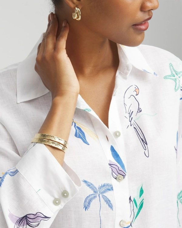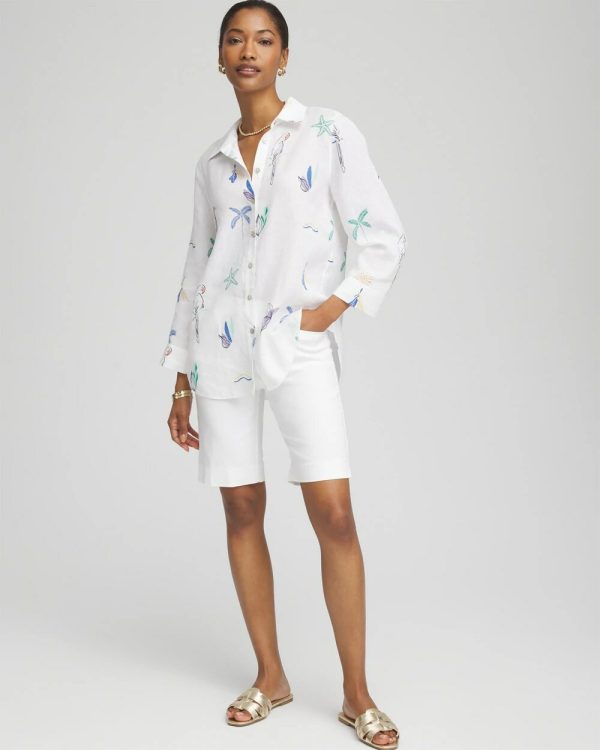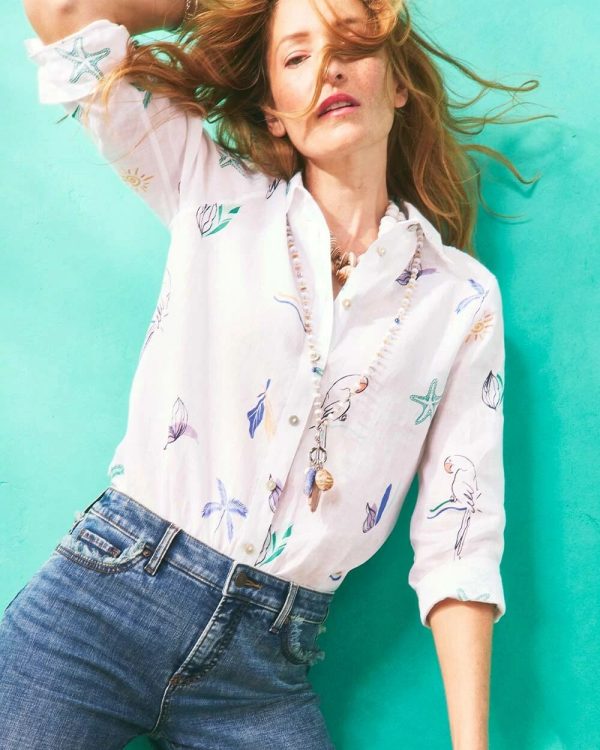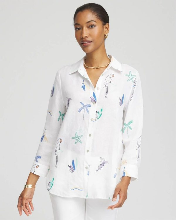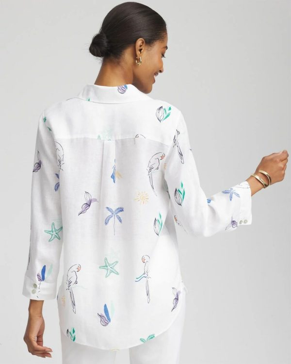 It’s no wonder we can’t keep our No Iron™ linen shirts in stock. This ready-to-wear right-out-of-the-dryer (without the hassle of ironing) top moves with you effortlessly for all-day comfort. It’s a perfect fit every time in any season, whether on its own or as a base layer. Designed with a flattering shirttail hem and a playful island motif set against a solid white linen backdrop, this button down pairs perfectly with jeans or pants.