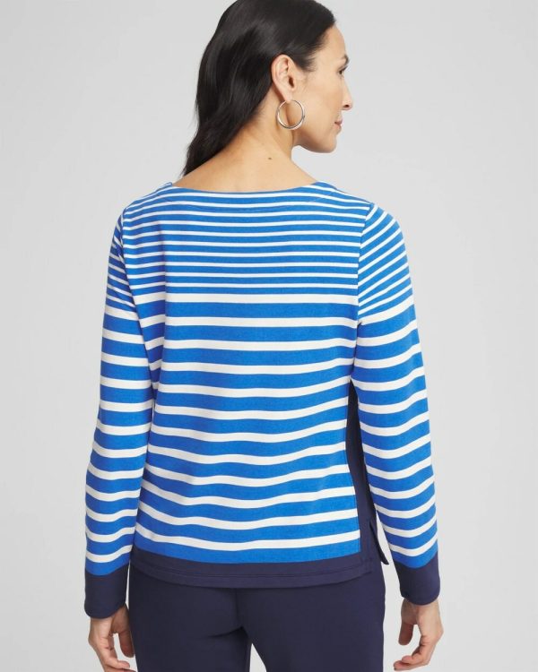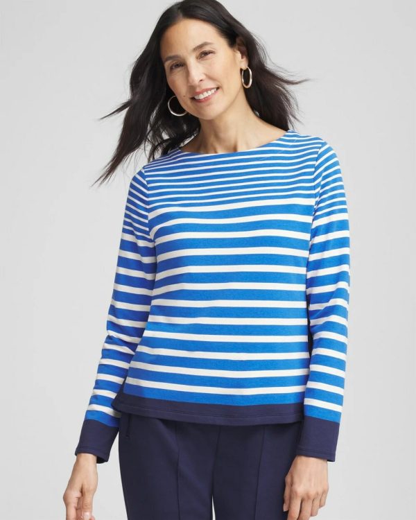 Updated for the season with a new print, this nautical-inspired Zenergy® Striped Boatneck Mariner Tee combines thin horizontal stripes and color block side seams with a boat neckline and our Chico’s woven label. Pair with Chico’s matching Zenergy® outerwear.