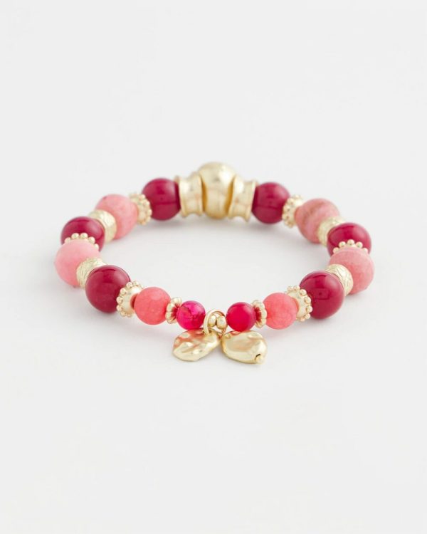 This new bracelet features Goldtone charms and tonal pink & red beaded stretch bracelet. A perfectly stackable, beautiful beaded bracelet. This piece is easy to wear and pair with other like pieces.