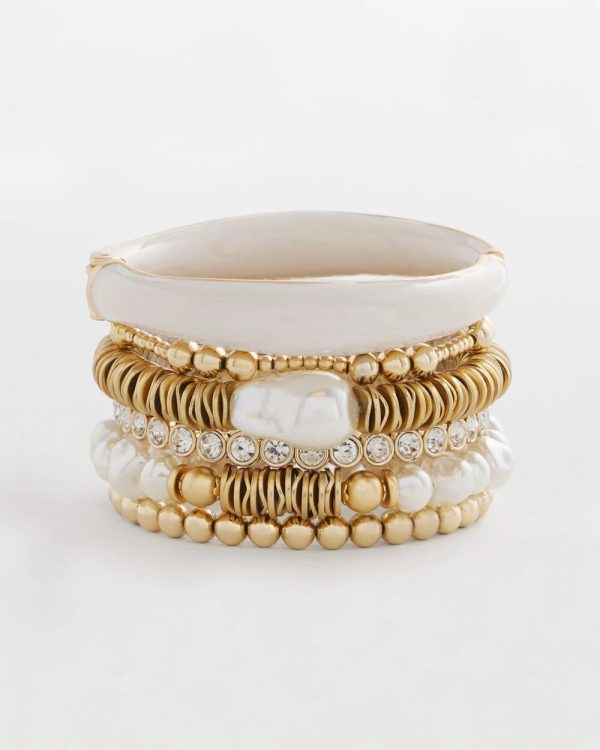 Add this eye-catching elegant White & Gold Hinge Bracelet to your staples for 2025. Featuring a sophisticated style. Pair with pieces from Chico’s iconic Collection.