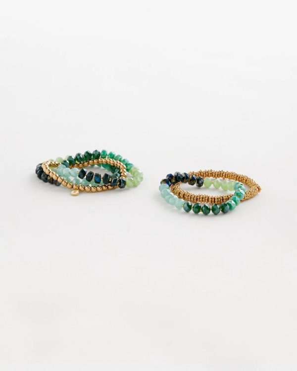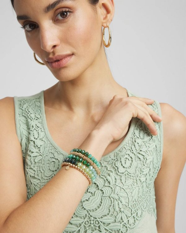 Chico’s customer favorite stackable bracelet sets got an upgrade for the season. Add this new Green & Gold Stretch Set of Five Bracelets to your jewelry box. Mixed-media beaded bracelet stack of five. Pair with other pieces from Chico’s Flower Bomb Collection.