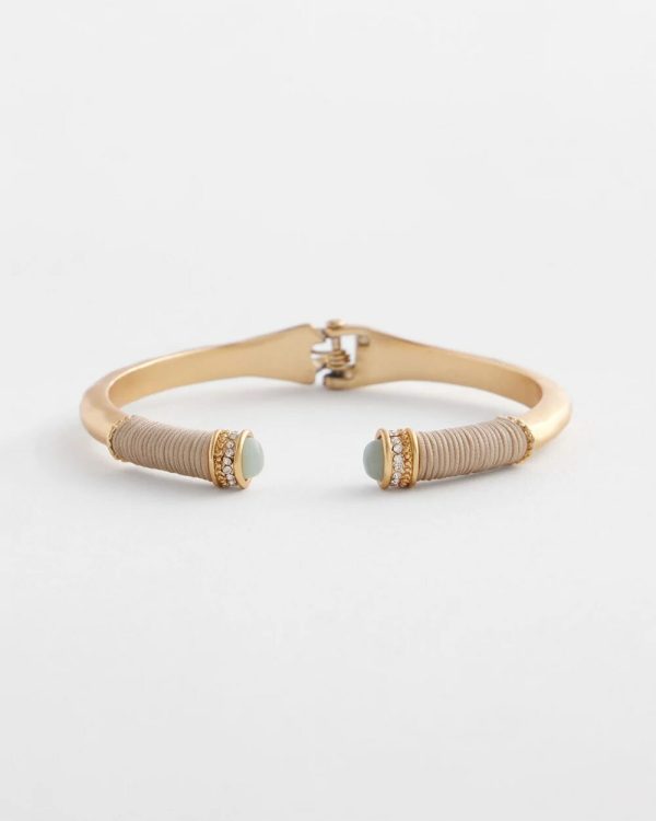 - Gold-tone cuff featuring genuine amazonite stone with hinge closure.