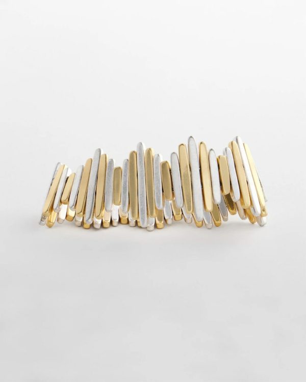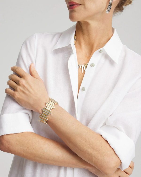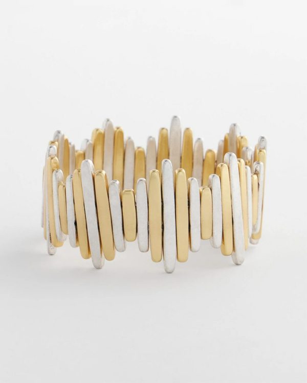 Adorn your styles with this new eye-catching stretch bracelet design. Gold and silver tone, with asymmetrical detailing, make this a perfect piece for a mix of summer solid hues. Pair with its matching earrings and necklace. Mix and match with like pieces from Chico’s new Fresh Finds Collection.