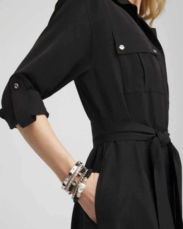 - Midi shirtdress; A-line skirt, fully-lined, collared, belted design with roll-cuff sleeves, and breast pockets.