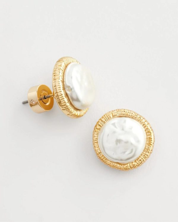 The perfect pearl earrings. Encased by a goldtone ribbon, these new pearl studs showcase a special technique that recreates the ultimate luxury of freshwater pearls. Pair with your goldtone, pearl, and ocean-inspired styles.