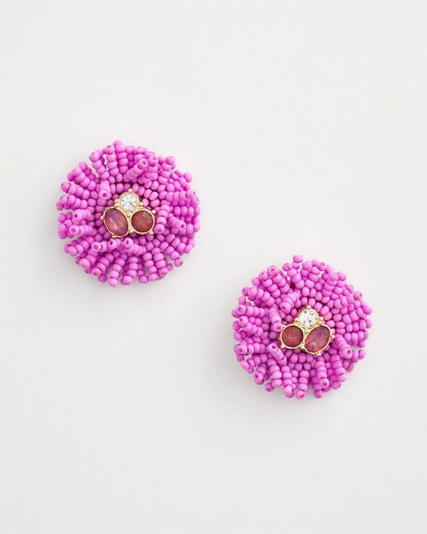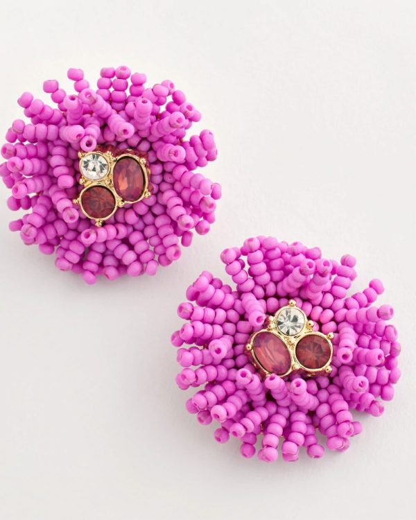 Delicate and lavish stud earrings, these new richly hued pink seed bead earrings formed into a flower motif. Featuring an iridescent center—showcasing a special technique to recreate three small diamond-like stones.