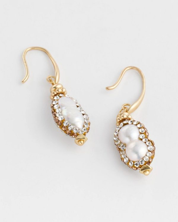 A new pair of freshwater pearl earrings, perfect for the endless serenity that is the summer season. Gorgeous gold-toned, showcasing a special technique that recreates a diamond crusted encasement effect. Two pearls merged together for each ear measuring approximately one inch. Natural pearls, will vary. Mix with like pieces and match with its matching bracelet.