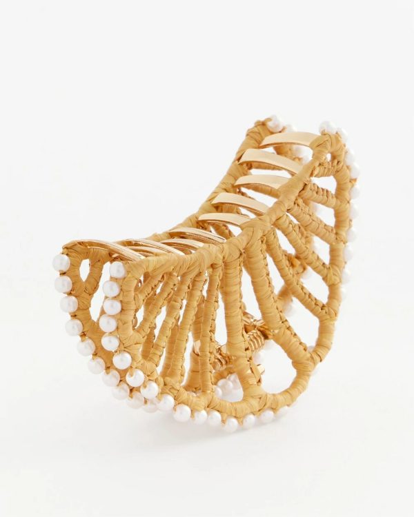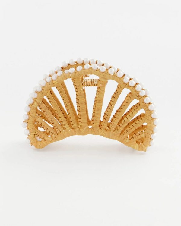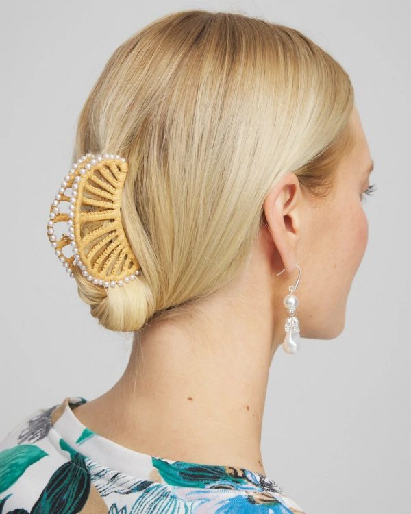 Elevate your accessories for the season with this raffia hair clip. Showcasing a special technique that recreates pearl effect accents.