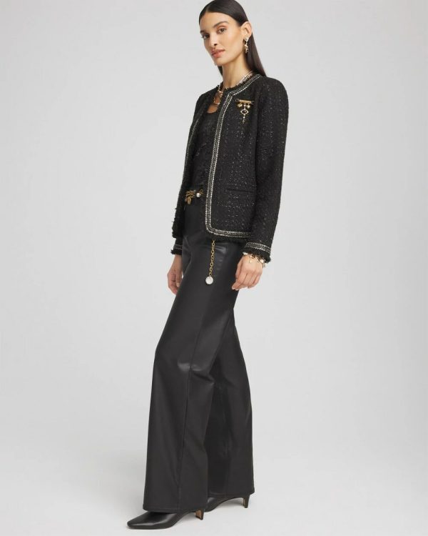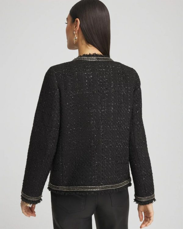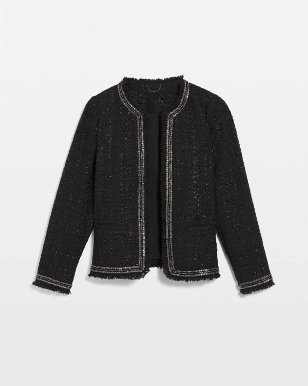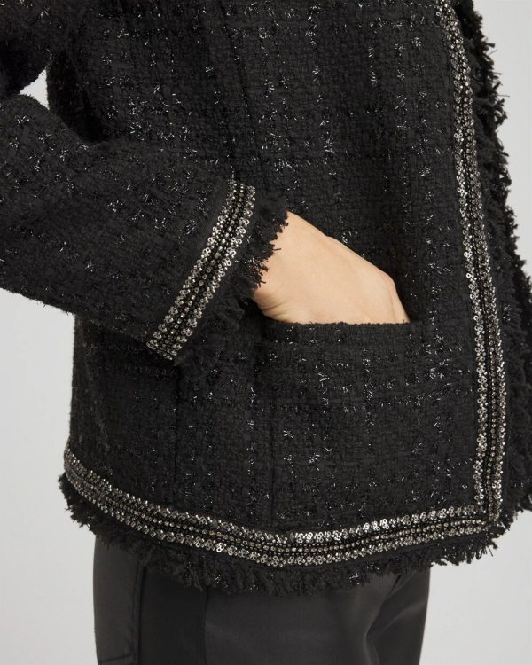 Accented with an elegant beaded border, our Embellished Tweed Jacket is just what you need for a flawless, elegant look. This design features shiny lurex thread throughout and functional pockets, making it the perfect topper for your seasonal outfits.