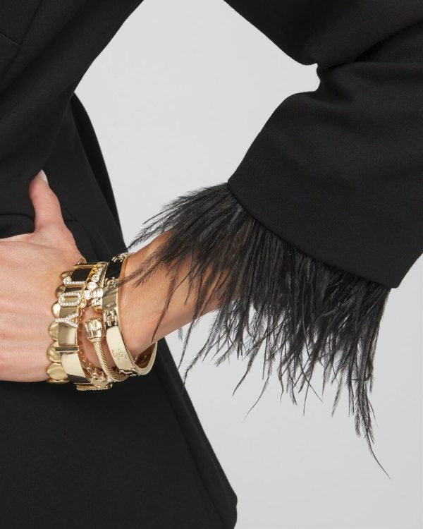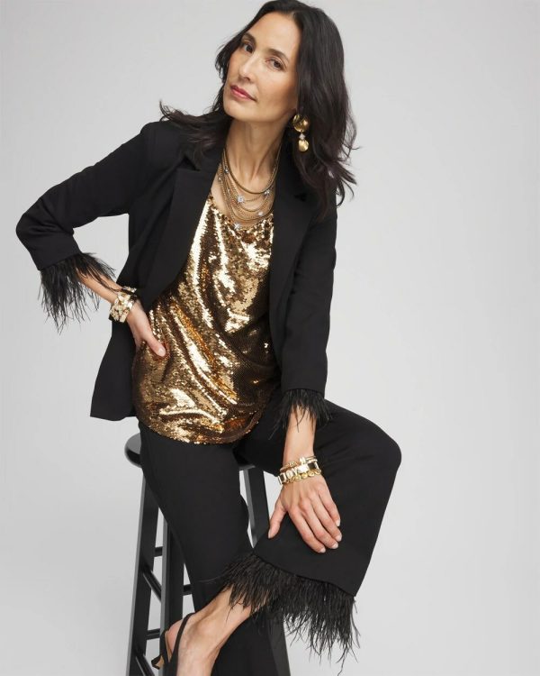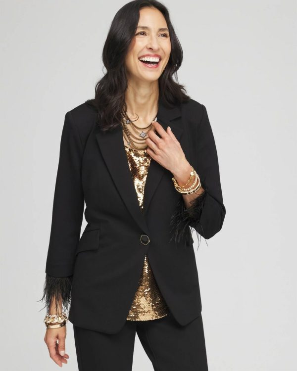 The new fashion staple for the holiday season, our new Feather Knit Blazer. Featuring a removable feather trim, front closure and novelty button. Made in our warm, cozy, and bestselling ponte fabric in time for the chilly season.