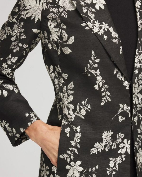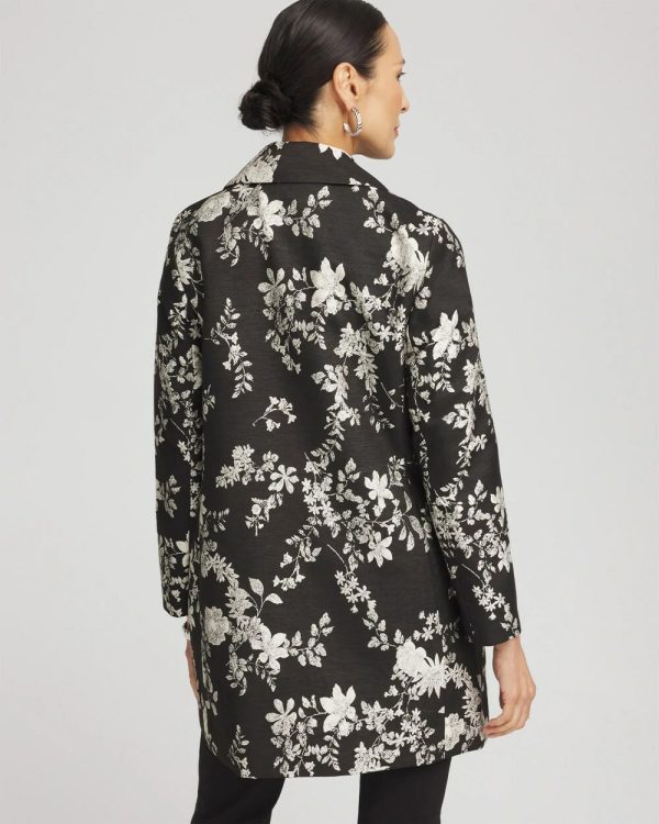 The Floral Jacquard Topper is sure to draw compliments. The notch collar and hook and eye closure give the jacket its classic look, but the floral print softens denim or black pants for an elegant pairing.