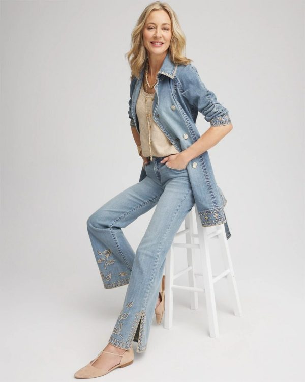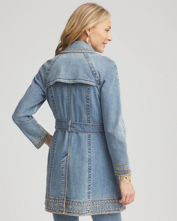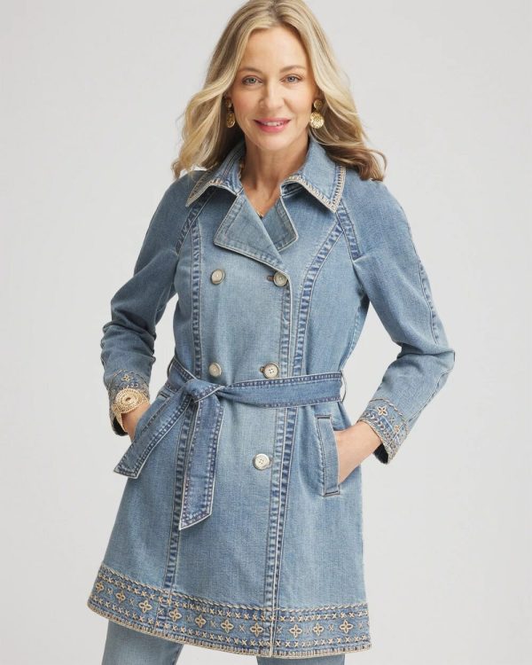 You will cherish this Petite Tailored Whipstitch Denim Trench Coat. With a western-inspired embroidery, fit and flare silhouette, double-breasted belted design, this will quickly become the best trenchcoat in your closet. Pair with made-to-match jeans for an eye-catching head-to-toe look.
