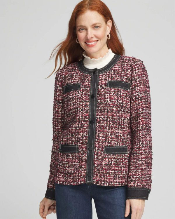 Stand out in this textured Tweed & Denim Trim Jacket. A classic look, modernized. Pair with Chico’s Girlfriend Flare Jeans for a coordinated and chic look.