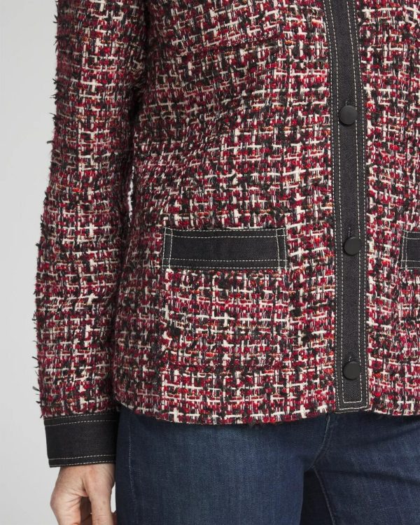- Classic fit jacket with front button closure, front pockets, and tweed & denim trim.