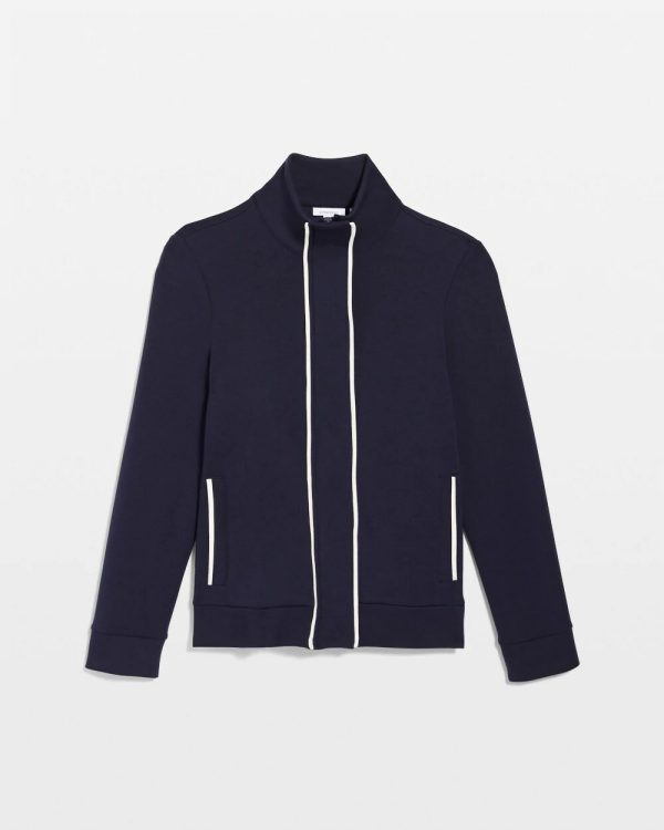 - Mockneck jacket with functional front pockets, full zip style with a concealed placket.