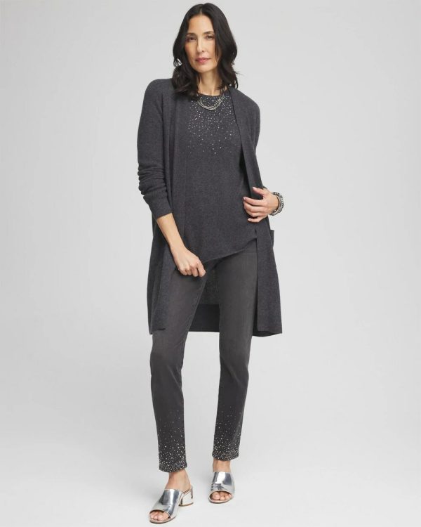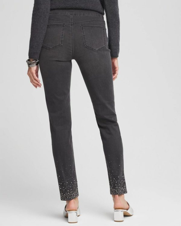 Our new ankle-grazing Vintage-Wash Embellished Jegging features a bejeweled ankle with ombré rhinestones designed to create a color graduation from light to dark. Pairs beautifully with tees, tops, sweaters, or blazers in any color. Perfect for all your holiday occasions!