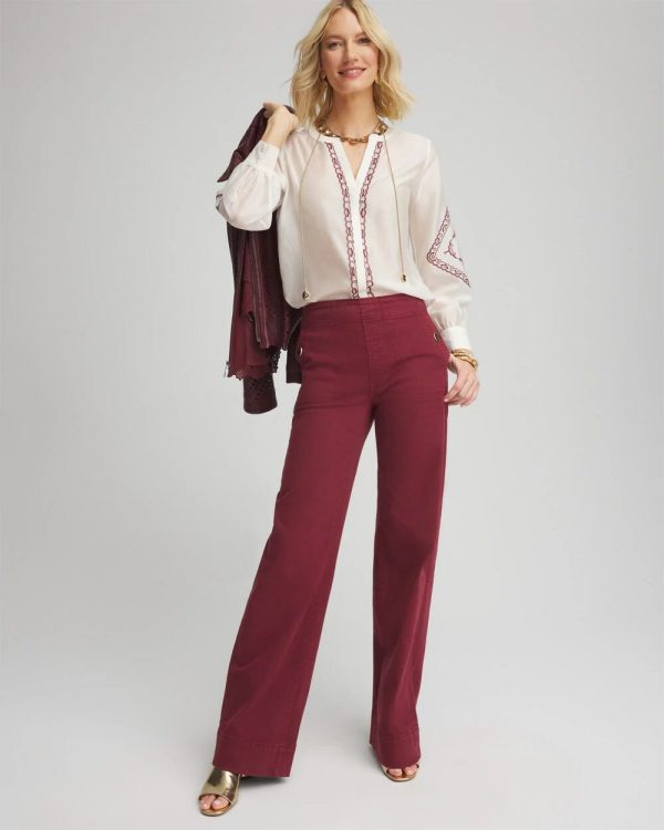You will love the way you look and feel in these high-style, deep red jeans. Featuring fun and fashionable front and back pockets accented by beautiful tortoise buttons and an ultra-flattering fit.