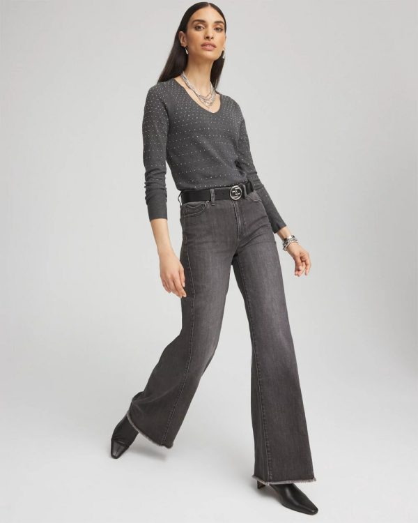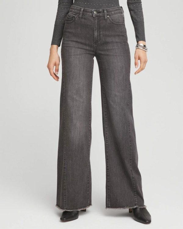 The wide leg jean has fast become a fashion classic, our pair of Wide Leg Frayed Hem Jeans have an elegant black wash, side seam details and frayed hems. These jeans look spectacular when paired with a fitted top or our matching denim jacket. On your feet you can easily choose sneakers, heels or boots.