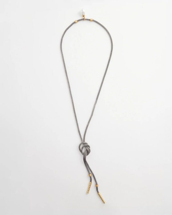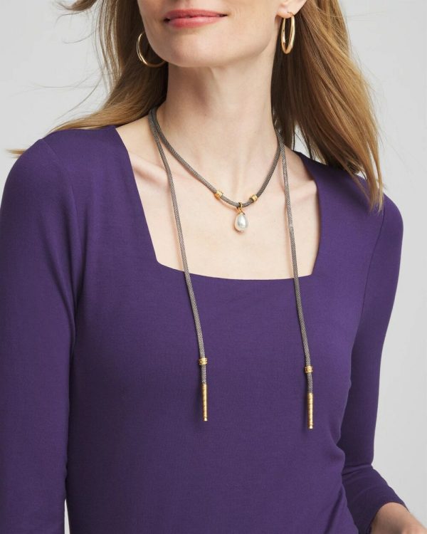 The Silver Lariat Adjustable Necklace is an elegant touch to add to shirts. The western appeal of the lariat is given a touch of glam with a faux pearl pendant. Layers this necklace with the Mixed Metal Coin Pendant and the Adjustable Coin Pendant, all from the Coin Jewelry Collection.