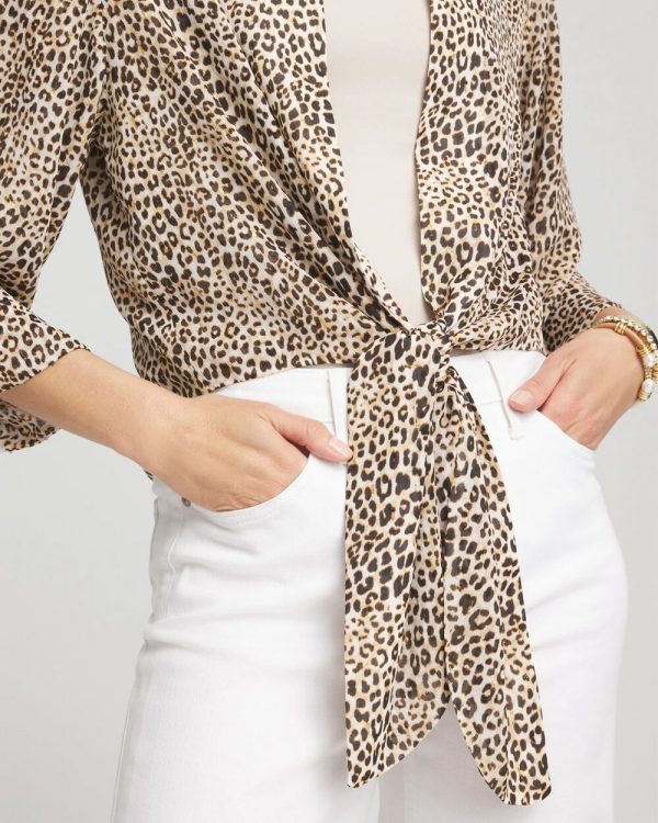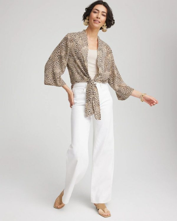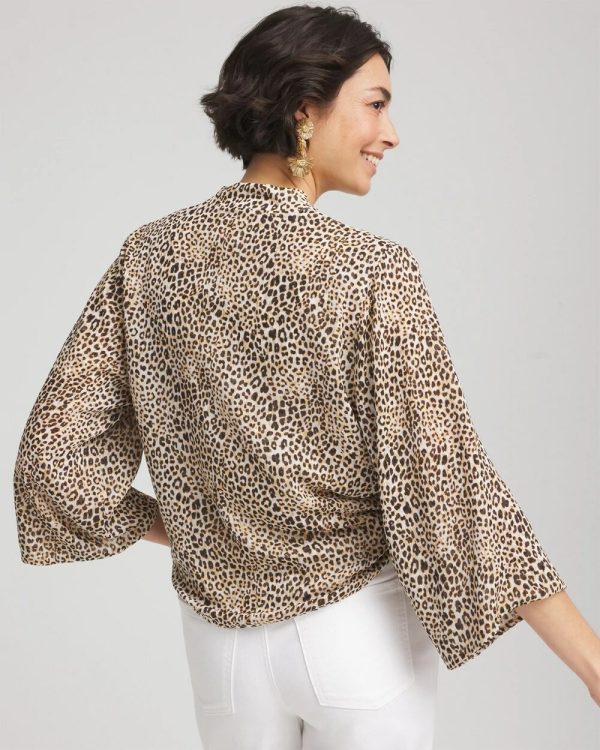 Long barrel sleeves, sophisticated built-up neck, lined kimono with a tie-front closure. An intricate animal print lends a playful motif to this perfect-for-vacation topper. Pair with its matching outerwear, dress it down with shorts on casual days, or dress is up with pants for more upscale affairs.