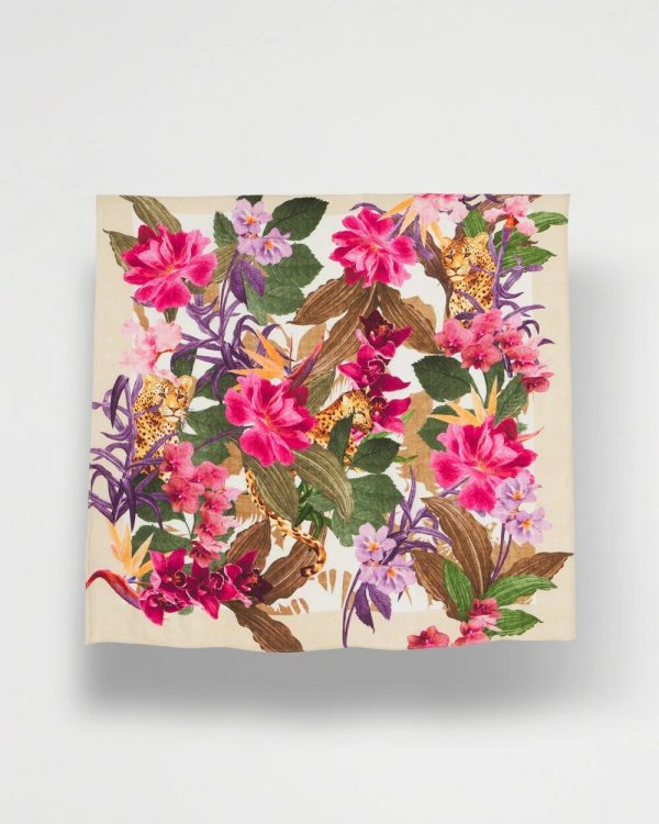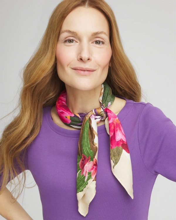 With so many ways to wear and accessorize, don’t miss out on this stunning Floral Square Satin Scarf. Matches other seasonal outerwear. Showcasing a floral print in neutrals, pink, orange, and green—wear around your neck, head, wrist, or as an accessory for your purse or beach bike.