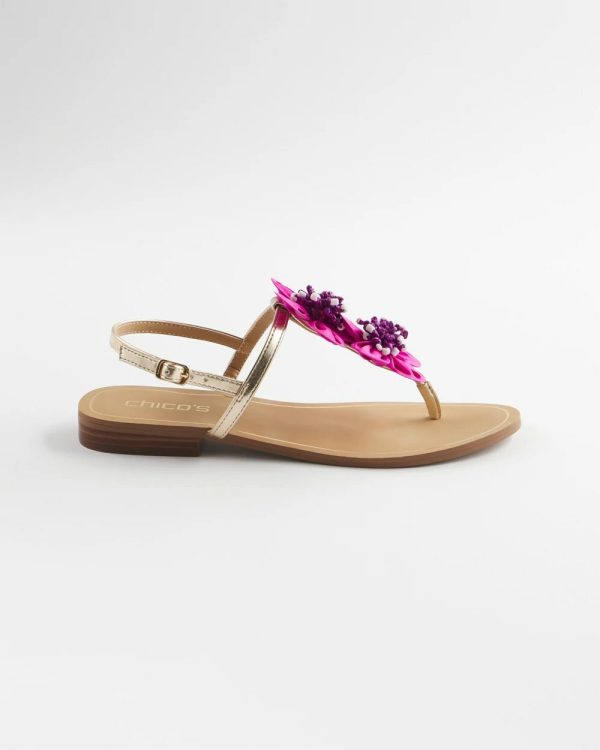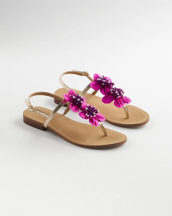Inspired by the season’s Art Deco style, finish off your styles with the Sunset Flower Sandal. Handcrafted with high-quality and sleek-fashion sense. Made with bold pink nappa pu with fabric and hand beaded flowers. The thong styling comes with a back strap for stability and adjustable buckle.