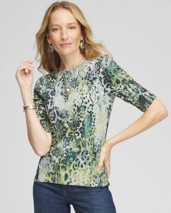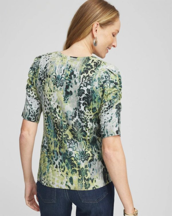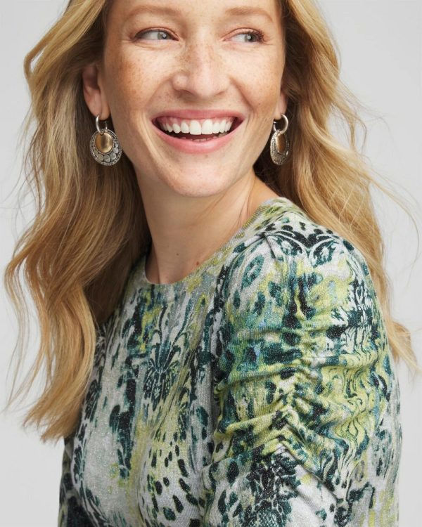 The new Animal Print Short-Sleeve Pullover Sweater is . The perfect layer for your festive best. With feminie ruched sleeves and a mixed naimla print, this sweater is a fun way to elevate your casual looks this winter.