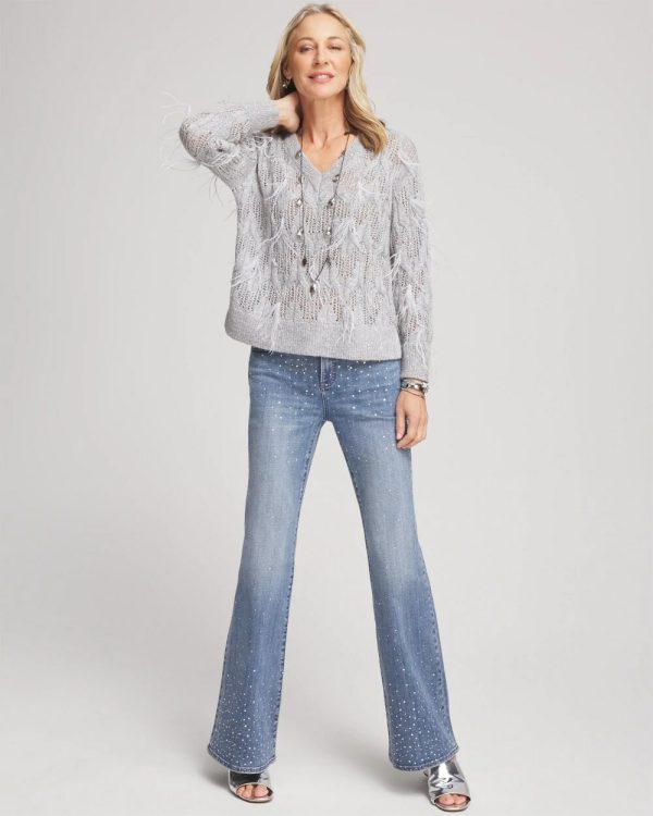 Wear this new Feather-Embellished Pullover Sweater to get into the swing of the holiday season. Soft, lightweight, and stunning, this design features faux feathers, sequins, and lurex for a subtle sheen.