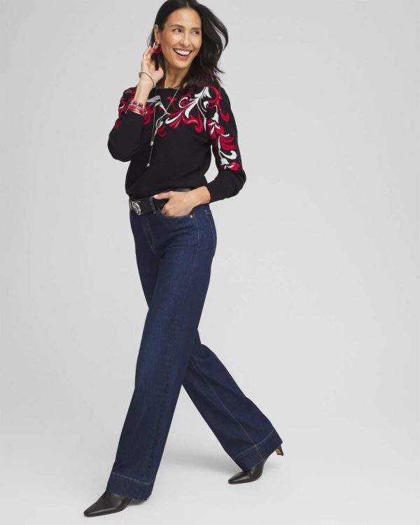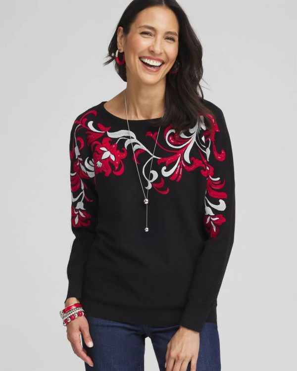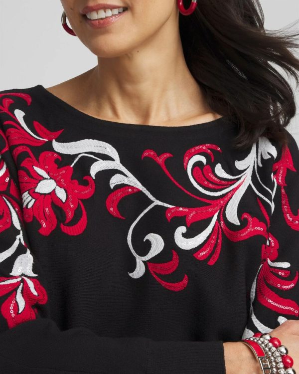 Our Floral Sequin Dolman Sleeve Sweater is simply stunning. The floral pattern is embellished with sequins for subtle sparkle, truly the perfect holiday sweater to pair with jeans or black pants.
