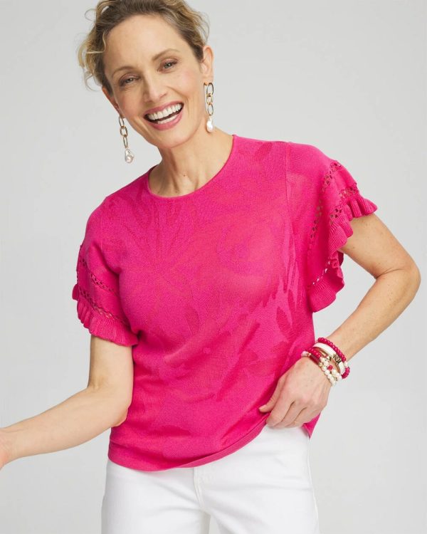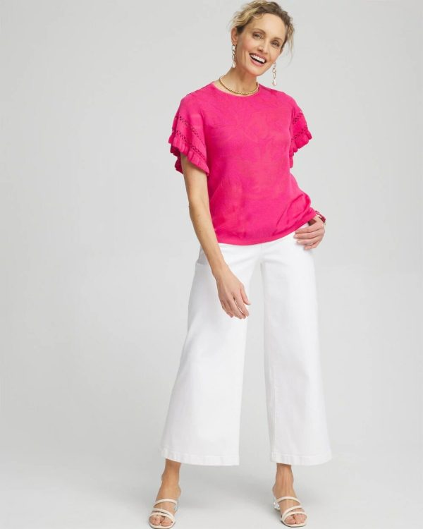 The Ruffle Sleeve Pullover Sweater has delicate details. This design features pointelle knit stitching on the ruffle sleeves and an easy knit body for everyday comfort. Paired with jeggings or jeans, this top has an easy but elevated fit.