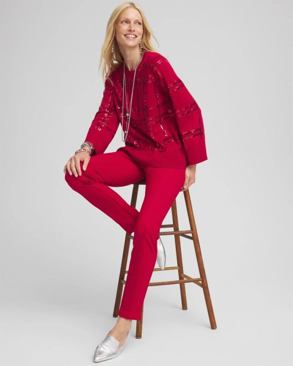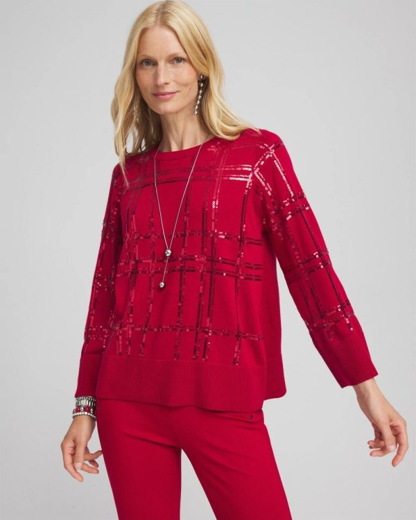 Get ready for the holidays in our Sequin Plaid Pullover Sweater. The plaid pattern is made from sequins in a tone-on-tone color that is gives it a subtle sheen. Paired with our Brigitte pants or jeans, this sweater is sure to be one of your seasonal favorites.