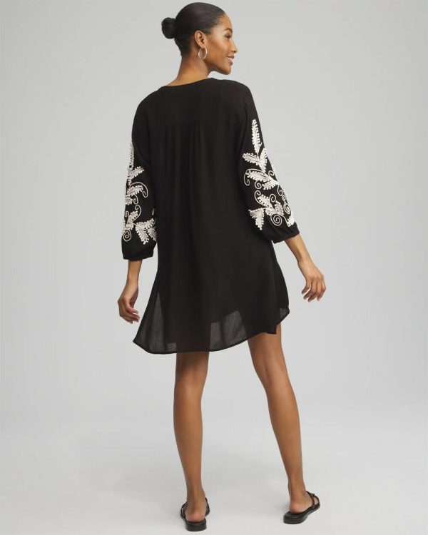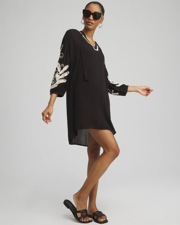 Feel confident in our Embroidered Coverup Dress. This bracelet sleeve coverup features a flattering V-neck with shirring and tassel accents, plus lovely embroidery details. Pair it with your favorite swimsuit and enjoy a walk on the boardwalk.