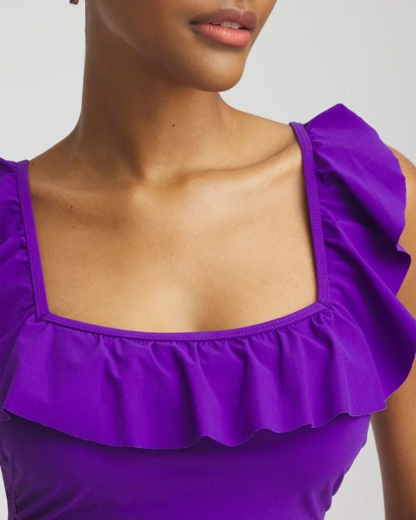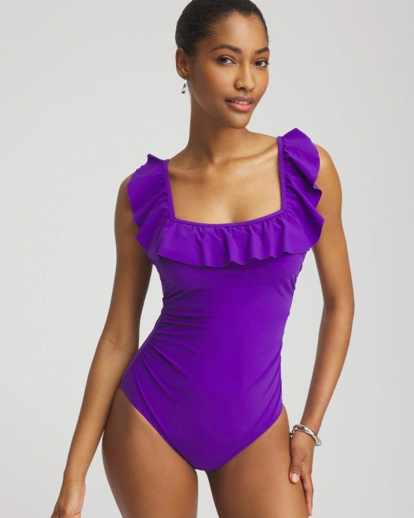 - Frame your feminine self in this ruffled one piece swimsuit, silhouetting your neckline and bustline.