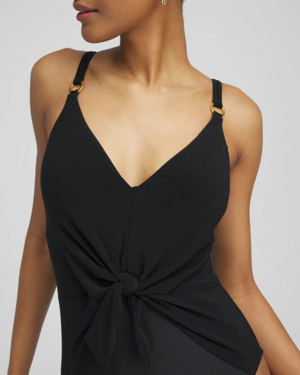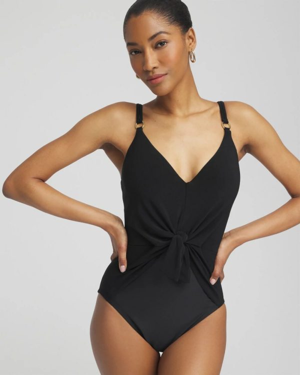 Feel confident in and out of the water in our Magicsuit Obi One Saki One Piece. Made with fabric that provides all-over body control to shape your figure, this design features a V-neckline, adjustable tie front, and sleek ring hardware at the straps. Pair it with a lightweight coverup and enjoy your time by the poolside.