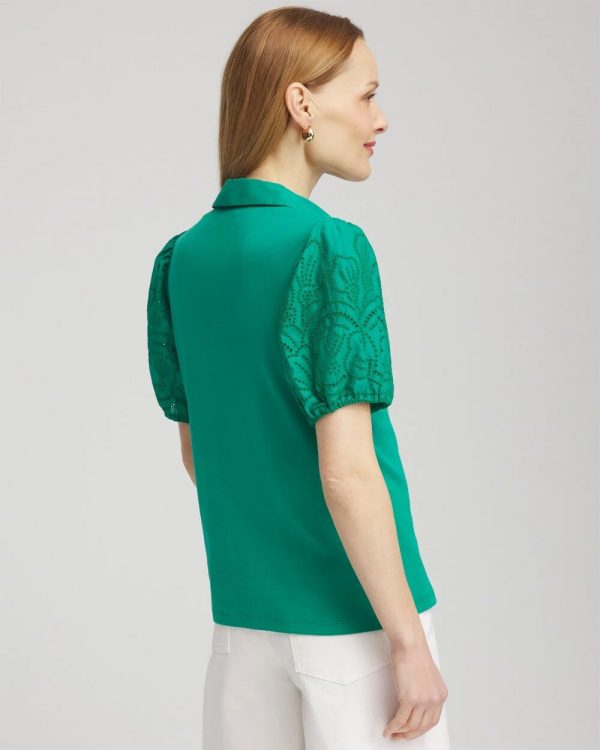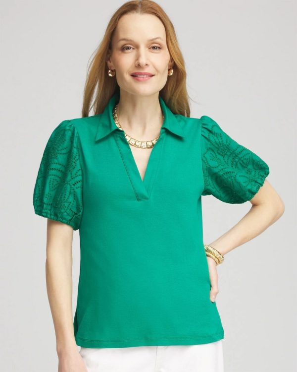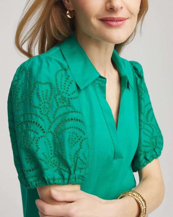 Eyelet elastic sleeves, a splitneck collar with lapels in this seasons unforgettable green shade. Cut from lightweight, breathable cotton, knit to perfection.See the Girlfriend Jeans collection to complete this cute and classy look.