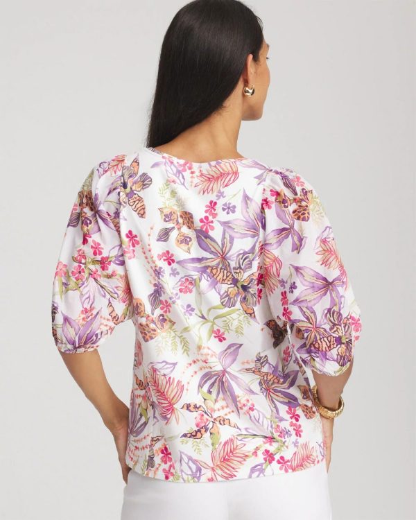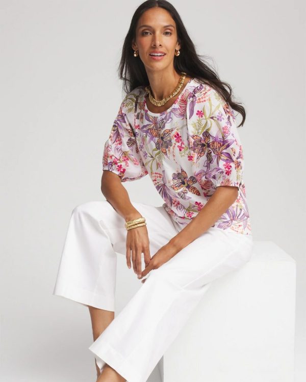A soft cotton-stretch knit body with cotton voile sleeves that hit at the elbow. Showcasing the season’s tropical floral motif on an alabaster backdrop. Jewel neckline and ultra-flattering fit. Pair with matching or alabaster pants and a stunning Chico’s statement necklace.
