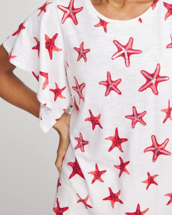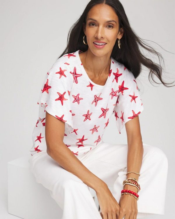 Show your love for the red, white, and blue in an ocean-inspired way with this tee featuring an embellished starfish and starfish print. Showcasing a mixed media motif including shiny sequins, set against a white backdrop. Modern handkerchief sleeves with an open airy underarm make this a summer festivity staple that’s unmistakably Chico’s, whether you wear it with jeans or a skirt. Pair with matching jewelry from this season’s 4th of July collection.