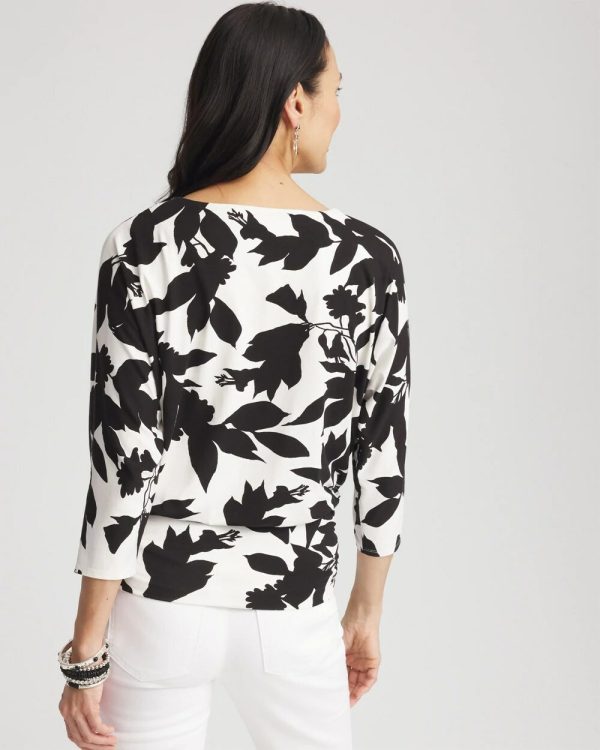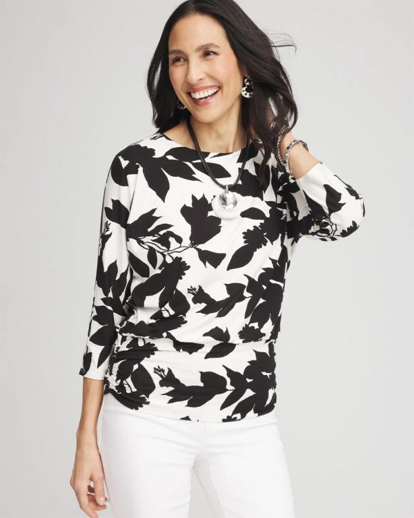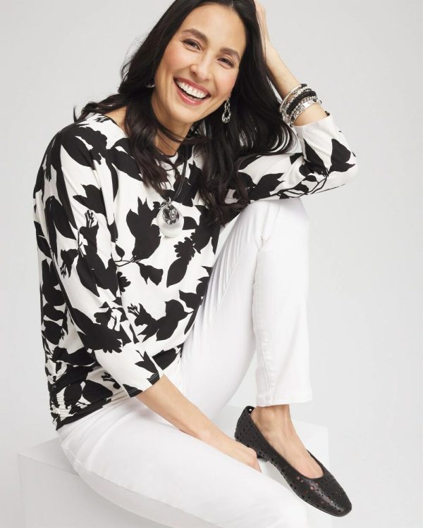 - Relaxed-fit; flattering 3/4 batwing sleeves with a bateau neckline.