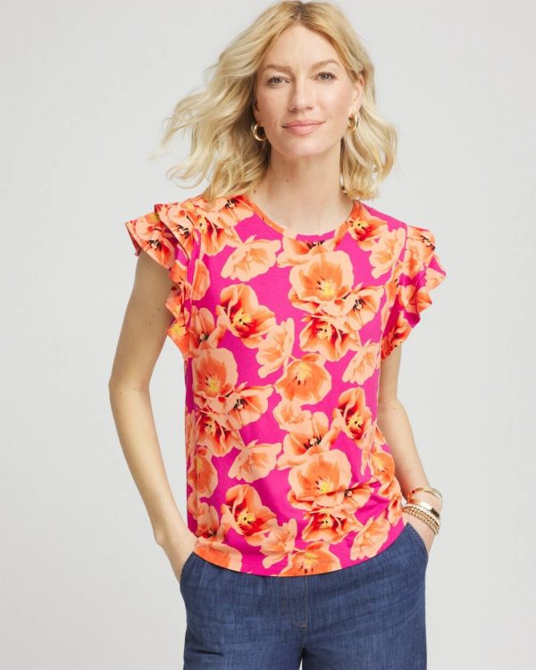 Where comfort and luxury collide: short, tiered flutter sleeves with a side panel for added movement and a classic crewneckline. Showcasing an island inspired tropical-floral print in rich orange hues set against a deep pink backdrop. Cut from lightweight Touch of Cool™ fabric designed to feel incredibly comfy and cool to the touch. Dress up this polished tee with matching pants or go for a casual look by pairing with jeans.