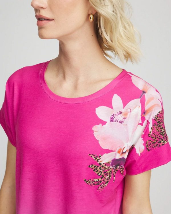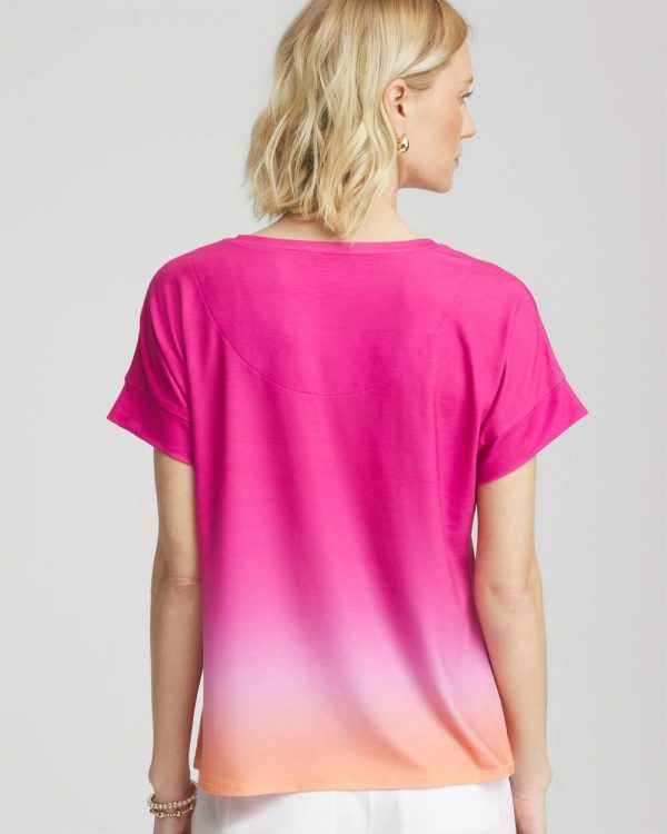 Lightweight soft-stretch slub fabric helps define this short dolman sleeved scoopneck tee. Showcasing a Rio-inspired ombre sunset color and printed floral design around the neckline and shoulder.