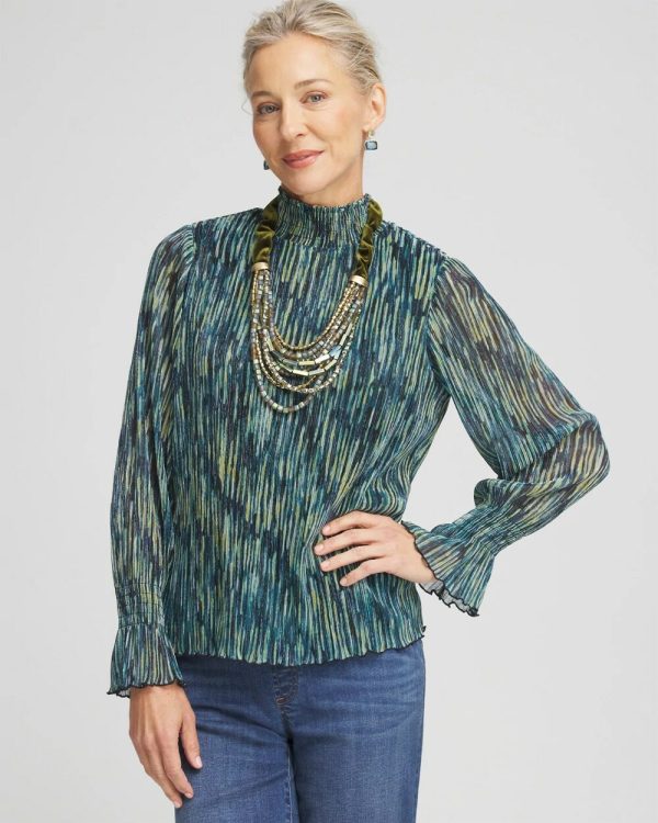 The Crinkle Shine Mock-Neck Top features a sleek style to elevate your holiday wardrobe. The mesh crinkle combined with shiny lurex thread and flared cuffs is perfect for your casual looks this season.