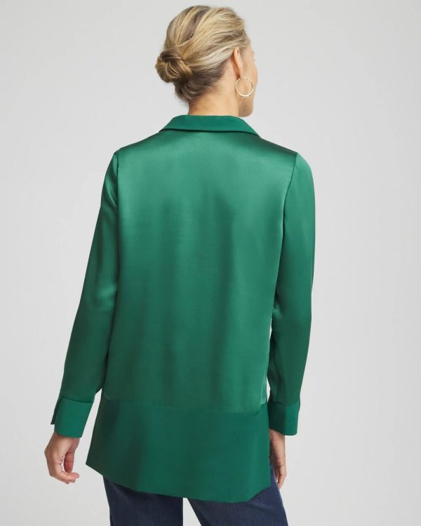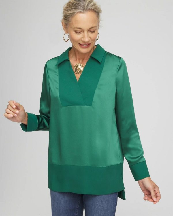 The Relaxed Stretch Satin Tunic make casual outfits easy. Made from stretch satin, this tunic has a collar neckline, long sleeves and side slits for comfort. The cuffs, collar and hem have a contrast finish in the same color. Pair with leggings, slim jeans or pants.