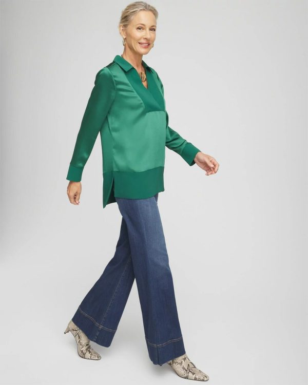 The Relaxed Stretch Satin Tunic make casual outfits easy. Made from stretch satin, this tunic has a collar neckline, long sleeves and side slits for comfort. The cuffs, collar and hem have a contrast finish in the same color. Pair with leggings, slim jeans or pants.